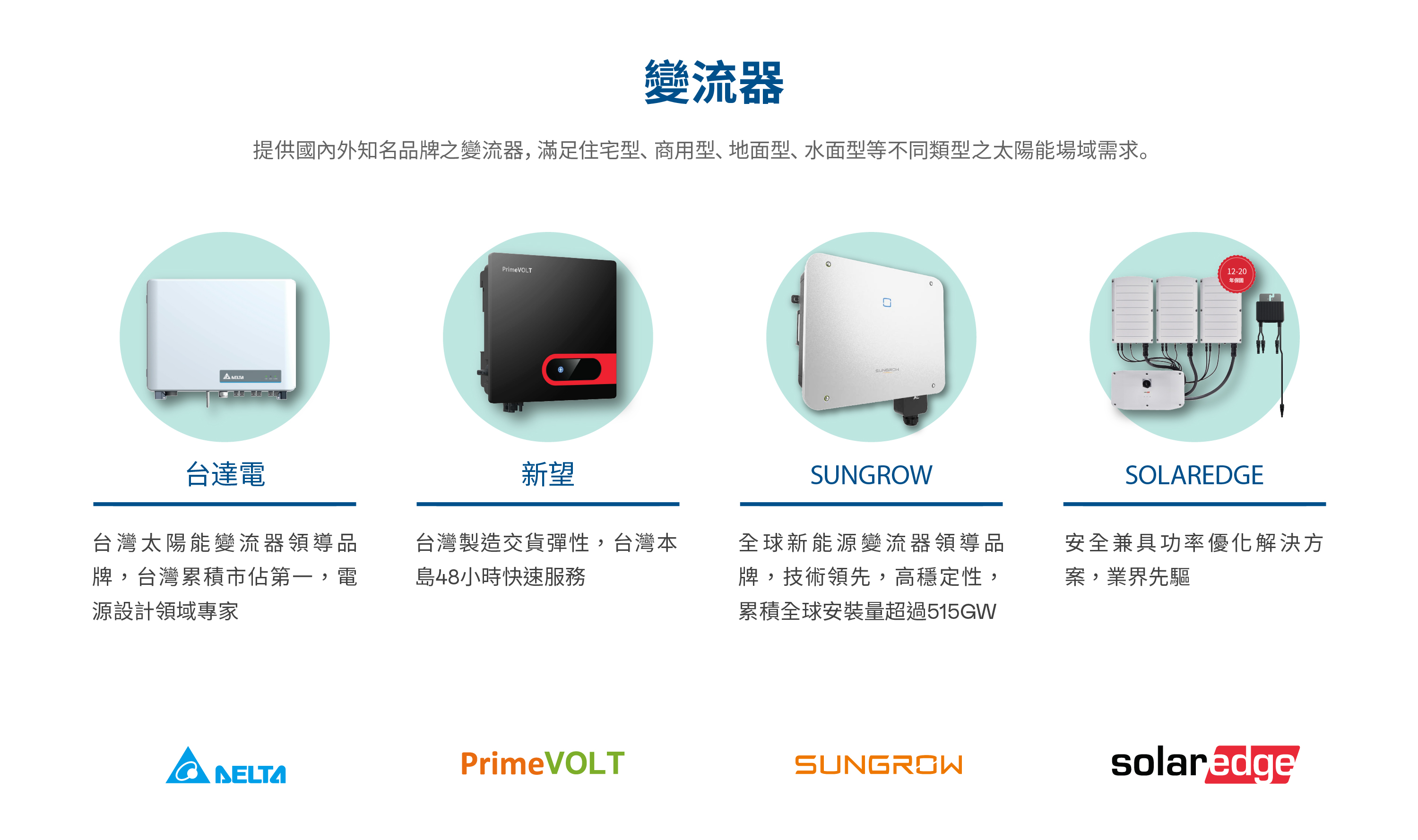 在「一站式購足」服務範疇下,友達除自有太陽能模組及監控監控軟硬體整合方案外, 同時提供客戶太陽能電廠其它的可靠優質零組件品牌與產品,包含電廠的重要組件如變流器、連接器、電線電纜、環境偵測裝置及相關輔佐材料與工具。